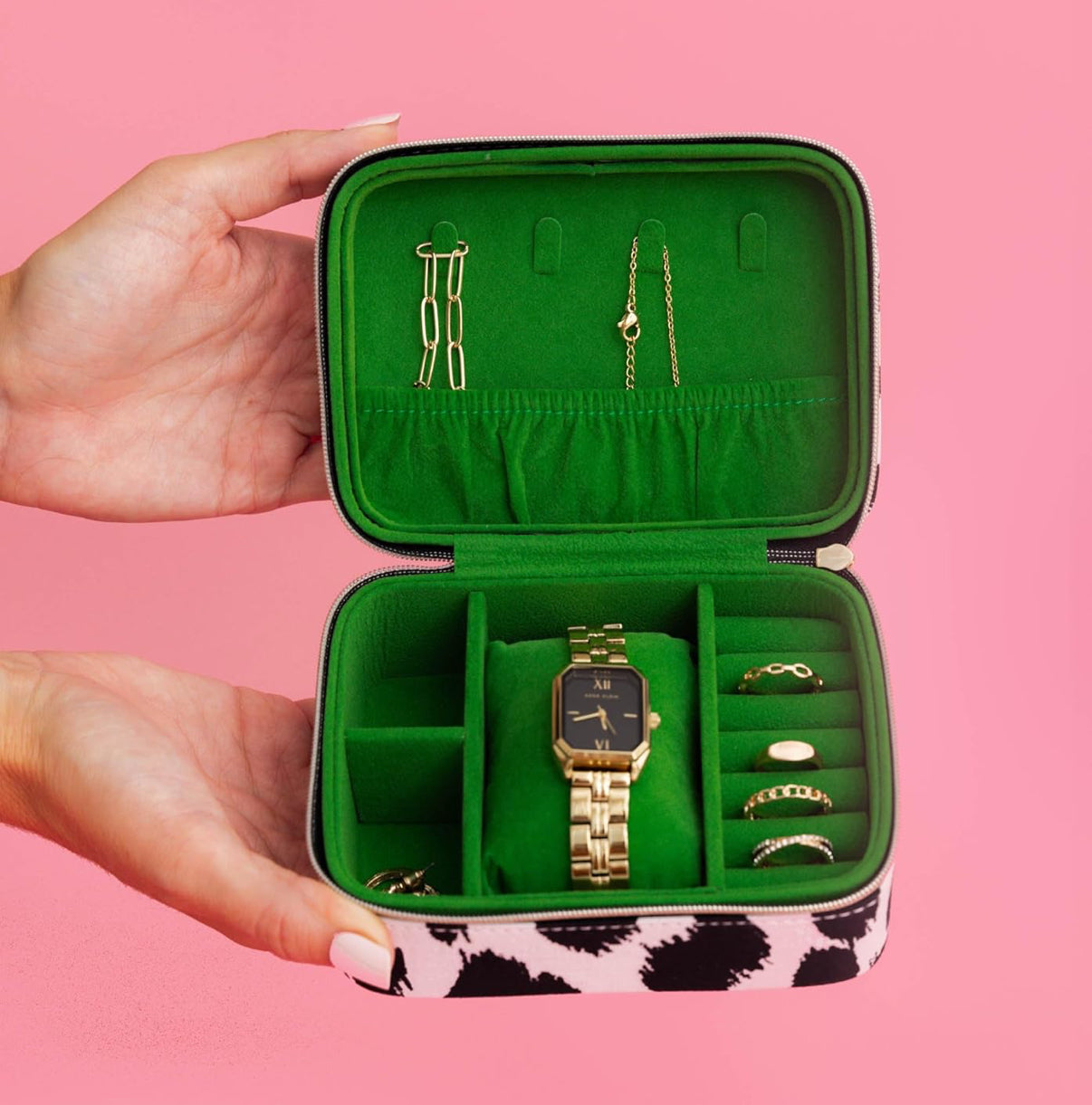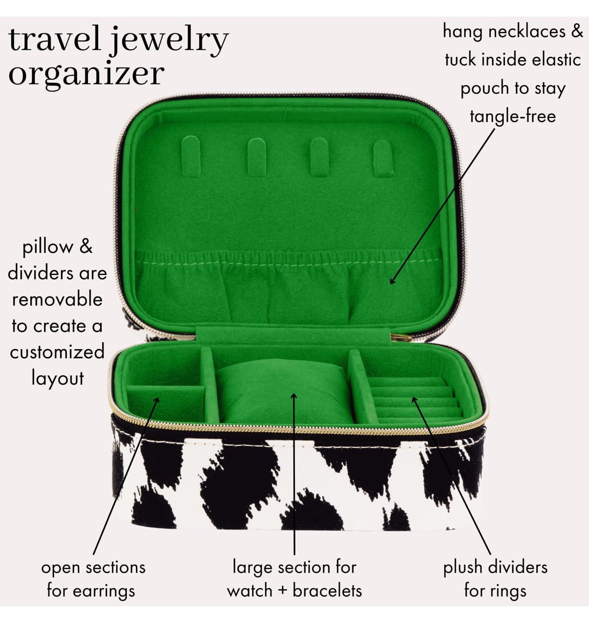 Safely store and travel with your jewelry in our chic leopard print Jewelry Travel Case by kate spade new york. The soft, green flocked lining protects and preserves your personal style. Features a hanging necklace pouch, ring slots, bracelet pillow, and earring dividers. Portable and secure, measuring 5.5" x 2.5" x 3.75".