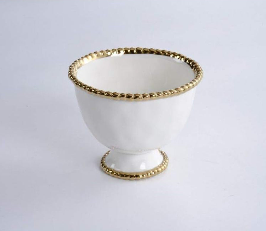 This small footed bowl from Pampa Bay is made of high fired porcelain and features a gold beaded rim. Its scratch-resistant material ensures that it will maintain its luster and be free of tarnishes. This versatile bowl is also oven-safe up to 500F, making it perfect for any occasion.