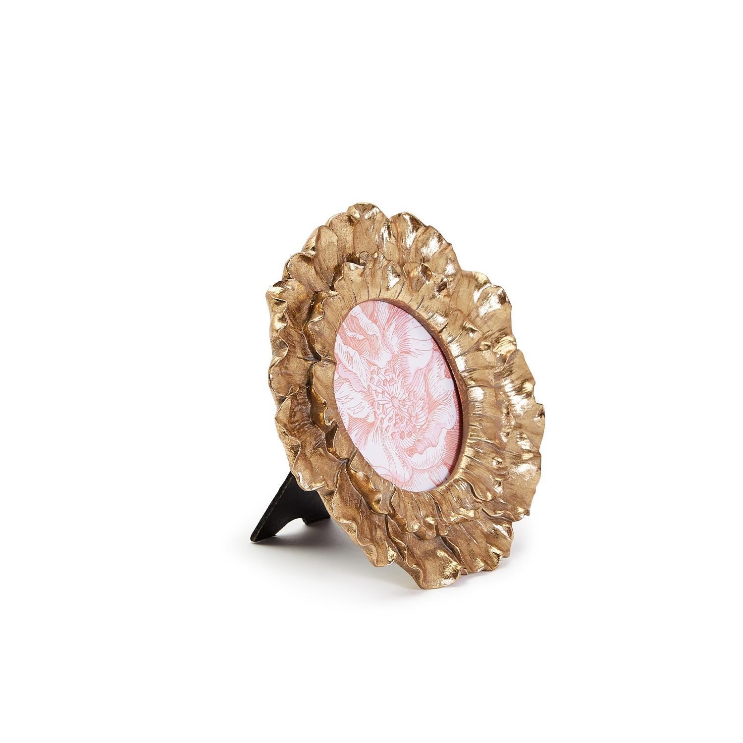 Elevate your photos with our Golden Flower Round Frame. Made of luxurious gold leaf and resin, this frame is both elegant and sturdy. Measuring 4"x4", it is perfect for displaying your memories. Its unique petal design and easel stand make it a beautiful addition to any room.