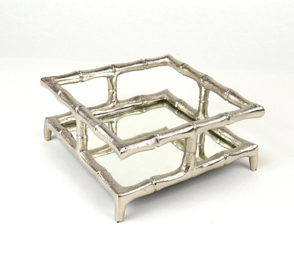 Elevate your entertaining with the Silver Bamboo Cocktail Napkin Tray. Expertly crafted from aluminum and finished in silver for a luxurious, sophisticated look, this tray holds napkins within easy reach of guests. At 6.75" x 6.75" and 2.5" high, it's perfect for any gathering. Classy and timeless, it's sure to impress at every event.
