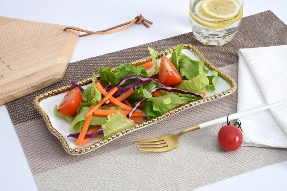 This small rectangular tray in Golden Salerno combines gleaming white porcelain with elegant lustrous gold beads in titanium, making it perfect for serving a variety of tasty treats. Not only is it food safe and dishwasher safe, it is also oven safe up to 550° for easy care. Add a touch of sophistication to your table with this versatile and functional tray.